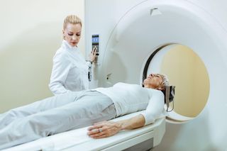 Лаборант помогает расположиться на столе томографа, выдает звукопоглощающие наушники и сигнальное устройство на случай ухудшения самочувствия.