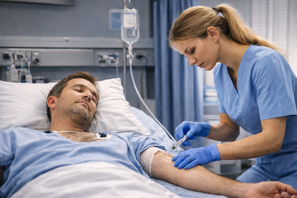 При потере сознания показано внутривенное введения глюкозы медицинским персоналом, в ряде случаев – внутримышечное введения глюкагона. В стационаре одновременно наблюдают за дыханием, сердечным ритмом, контролируют кровь, при необходимости вводят препараты для коррекции артериального давления, судорог и других осложнений.