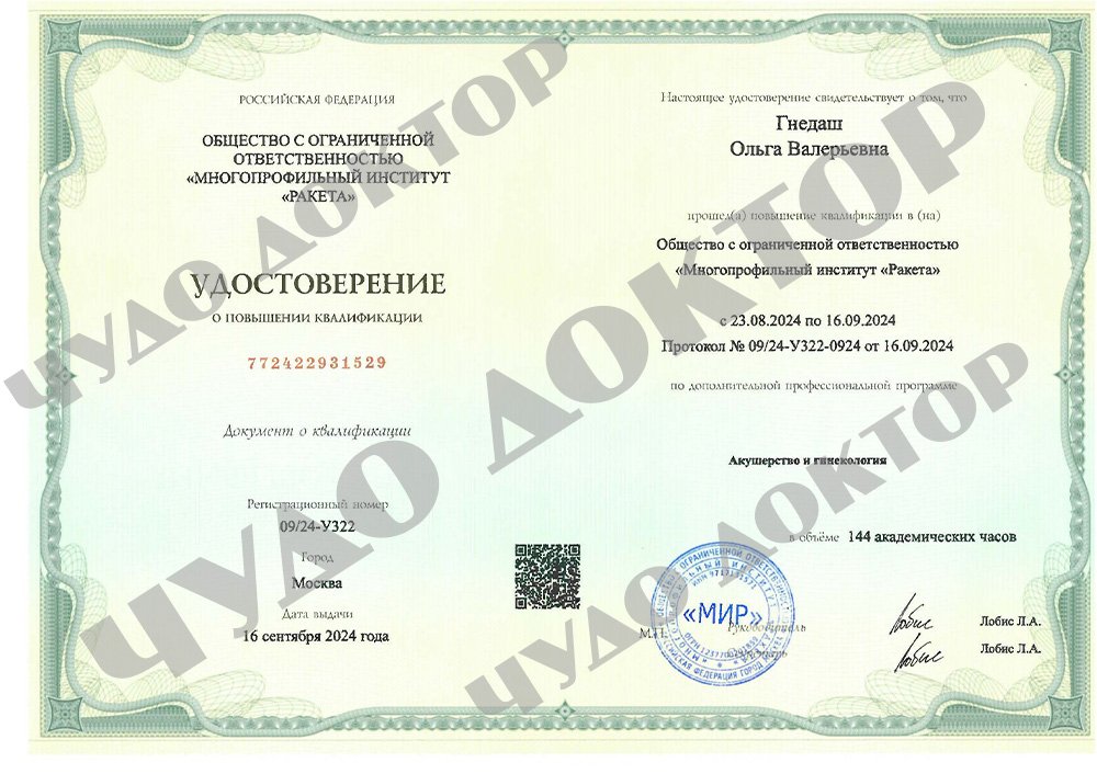 2024 г. - Повышение квалификации по программе « Практическая гистерорезектоскопия», Академия развития инновационных технологий