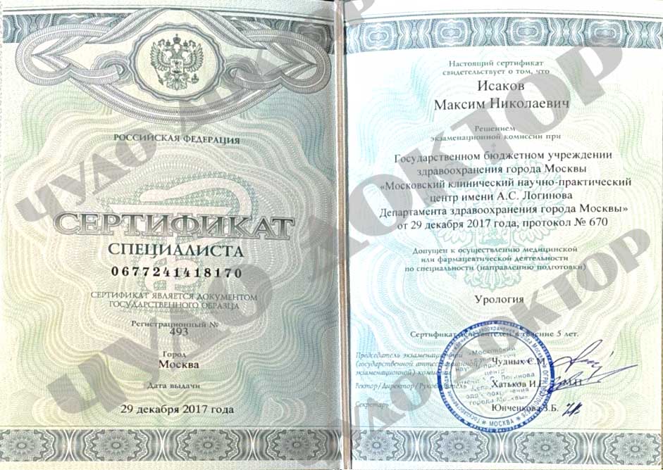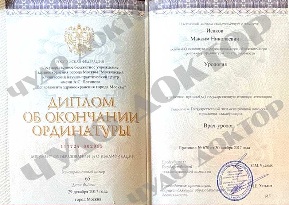 2017 г. – Московский Клинический Научный Центр им. А.С. Логинова» ординатура по специальности «урология»