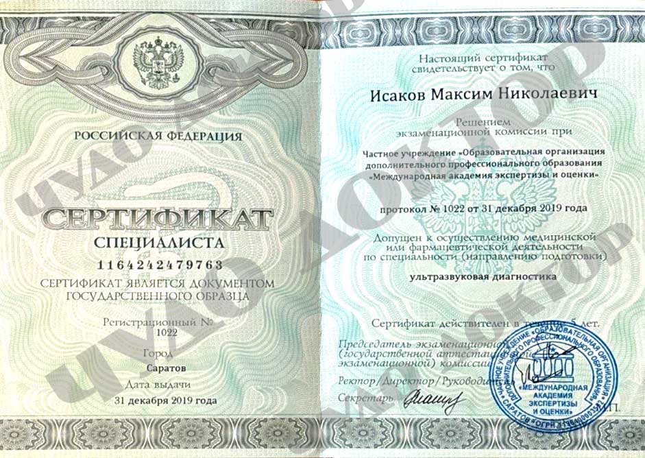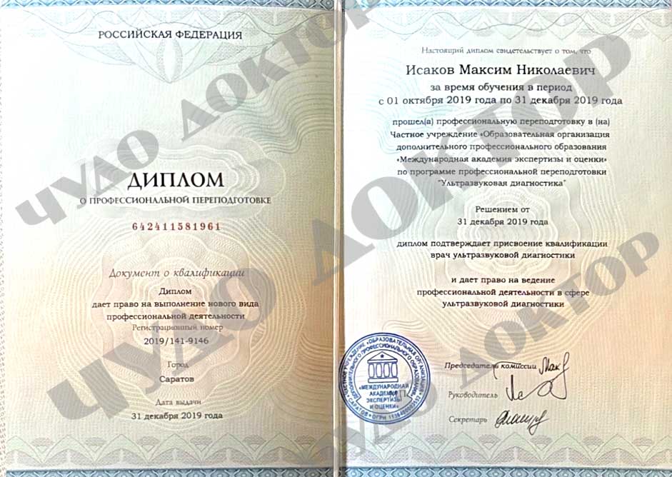 2019 г Частное учреждение Образовательная организация дополнительного профессионального образования « Международная академия экспертизы и оценки» по программе профессиональной переподготовки « Ультразвуковая диагностика»