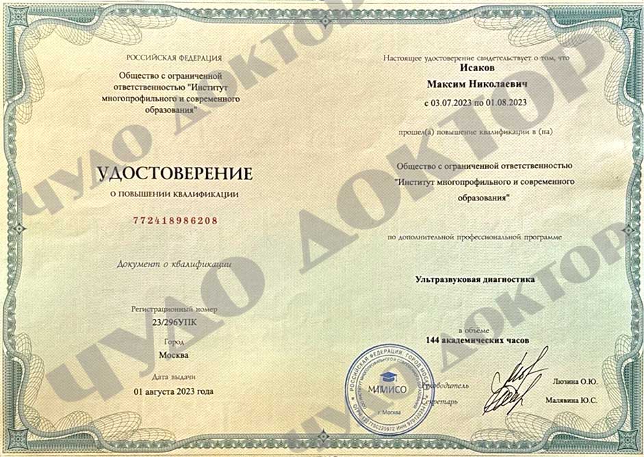 2023 г. Общество с ограниченной ответственностью « Институт многопрофильного и современного образования», повышение квалификации по специальности « ультразвуковая диагностика»