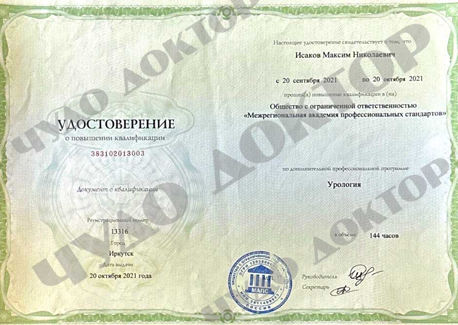 2021 г. Городская клиническая больницаственностью "Межрегиональная академия профессиональных стандартов», повышение квалификации по специальности «урология»