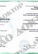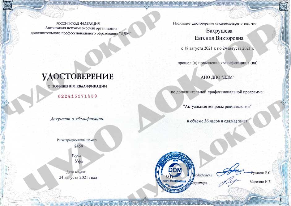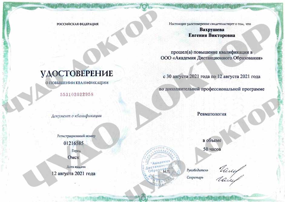 2021г. – Межрегиональный институт дополнительного профессионального образования, Противовоспалительная и иммунодепрессивная терапия ревматических заболеваний.