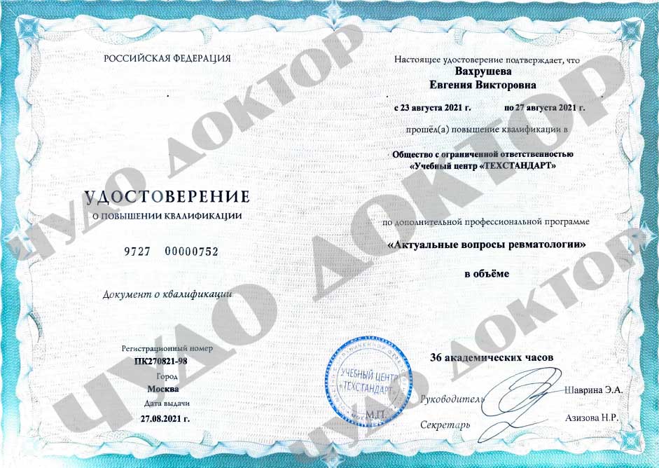 2021г. – Учебный центр Техстандарт, Актуальные вопросы в ревматологии.
