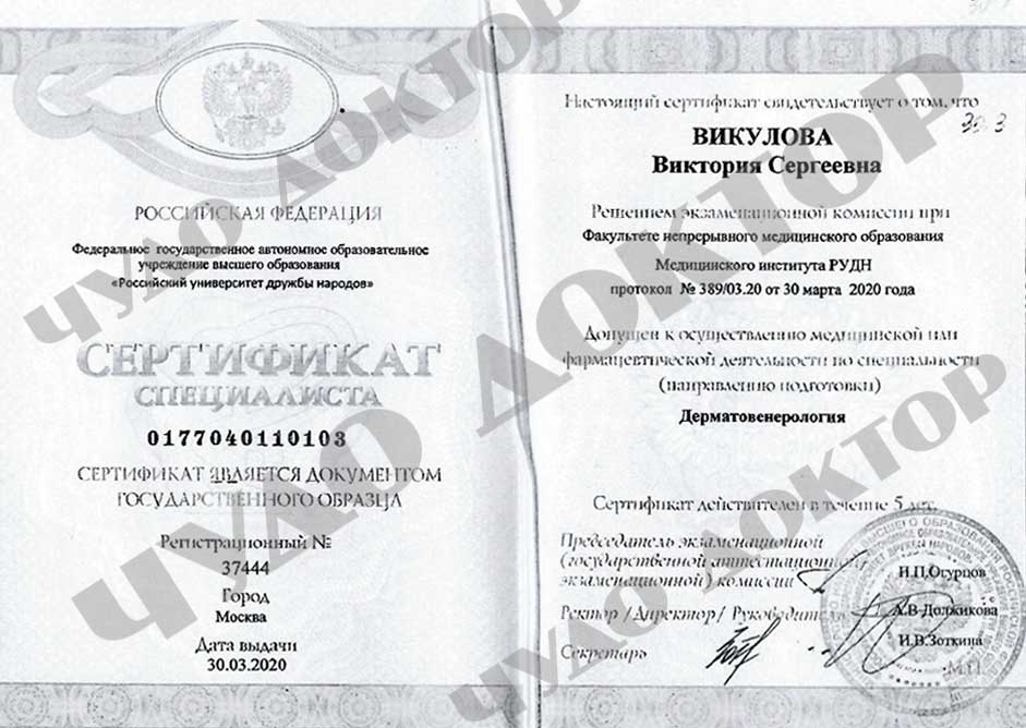 2020г. Повышение квалификации по специальности «Дерматовенерология» ФГАОУВО "Российский университет дружбы народов". периодическая аккредитация по специальности «Косметология»