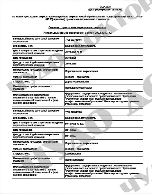 2025г. - периодическая аккредитация по специальности «Дерматовенерология» ФГБОУ ДПО "Российская медицинская академия непрерывного профессионального образования "Министерства здравоохранения РФ.