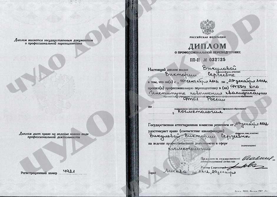 2012г. Повышение квалификации по специальности «Косметологии» ФГБОУ ДПО Институте повышения квалификации ФМБА России.