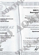 2002г. Усовершенствование по специализации «Применение методов аппаратной физиотерапии в косметологии» Российского научного центра восстановительной медицины и курортологии МЗ РФ.