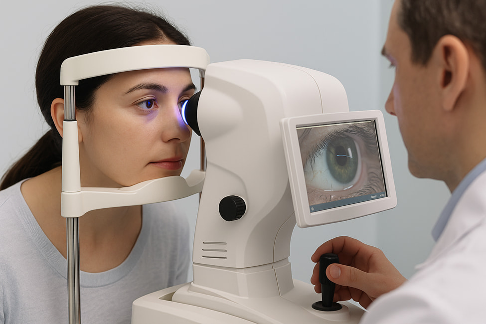 Пациент садится перед прибором, и врач проводит исследование в зависимости от типа оборудования. При бесконтактном методе достаточно сфокусировать взгляд на светящейся точке — сканер автоматически измеряет параметры роговицы в разных зонах. Метод полностью безболезненный и занимает не более 3 минут.